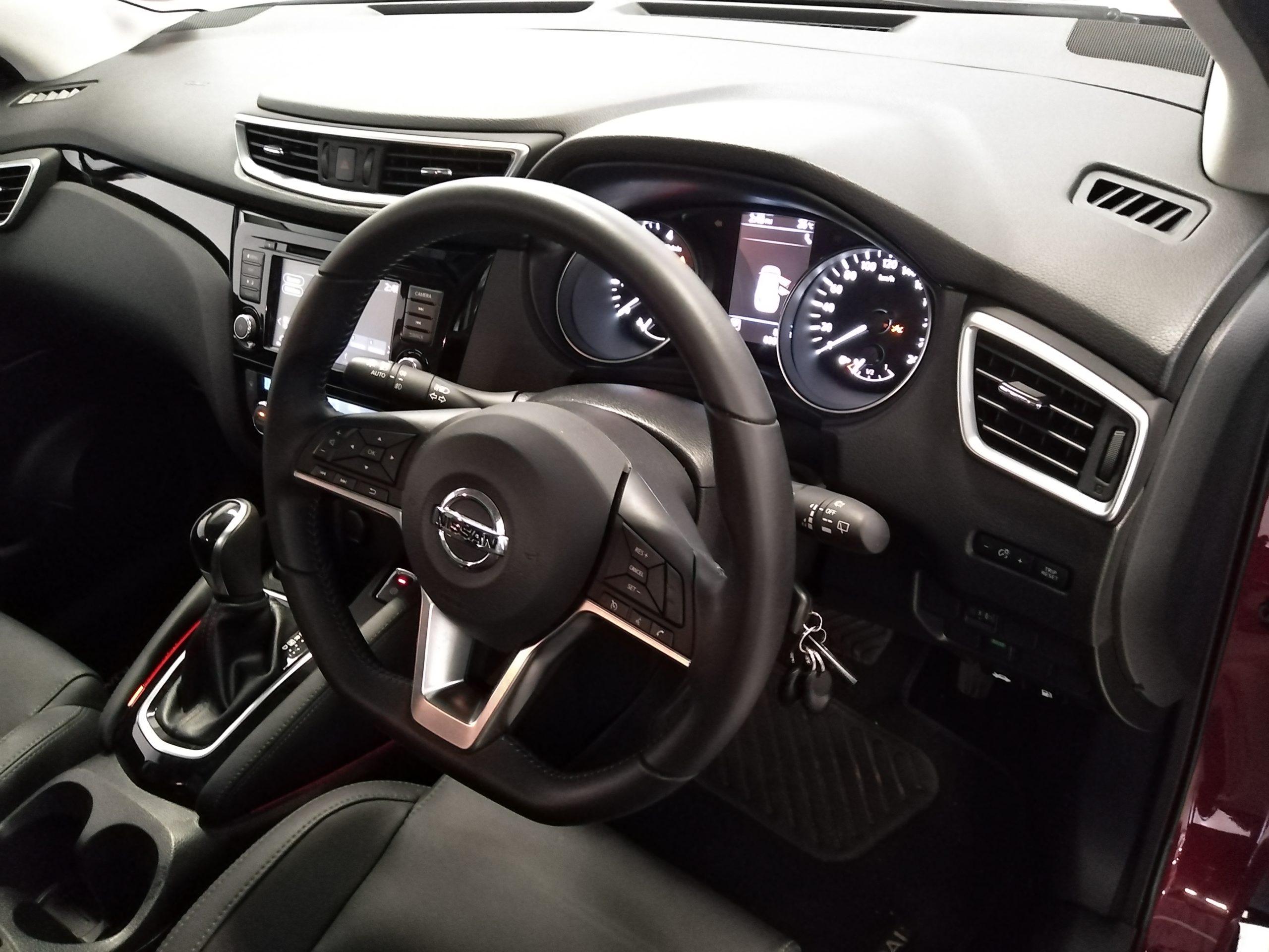 The new headlamp design features a striking LED Daytime Running Lights making this SUV a stunner. It is also infused with character. Two new designs of alloy wheels are available – including this stunning 19”inch version. It makes a statement with silver finish roof rails, and glass roof on the range topping. The Tekena makes one experience more of the world outside through the new panoramic glass roof with electric one touch shade. This is available on the Tekna model with advanced detail, the ultimate urban crossover has been fine-tuned to perfection. Therefore, it says take control behind the sporty D-Shaped steering wheel and to take on the streets with confidence. Interior touches are ranging from high-quality finishing materials and new instrument panel to the leather gear leaver – so it adds to the premium environment of your new Nissan Qashqai.